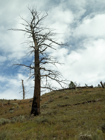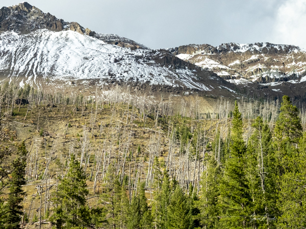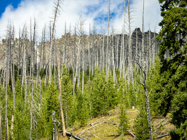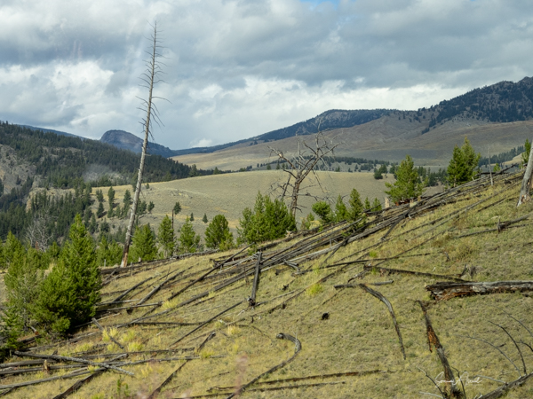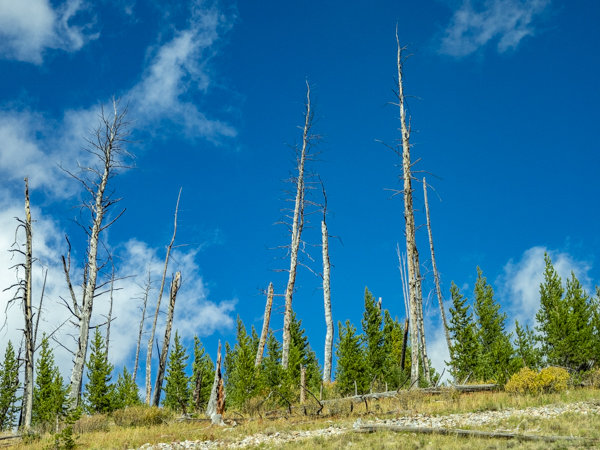 Fires happen. Sometimes it is due to lightning strikes. Sometimes it is an accident due to a stupid person tossing cigarette or a camp fire gone rogue. Forest fires occur in Yellowstone every year, but the largest and most devasting one was on âBlack Sunday,â in August of 1988 due to a drought and high heat in mid-July. Strong winds spread the fires faster than anyone could respond and more than one-third of the park, 793,800 acres (1240 square miles), were burnt. There have been other fires since, and as we drove through the park, we saw evidence of this loss over and over again.
