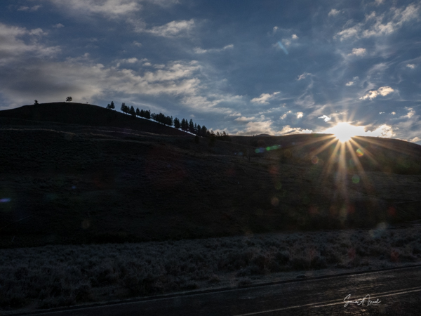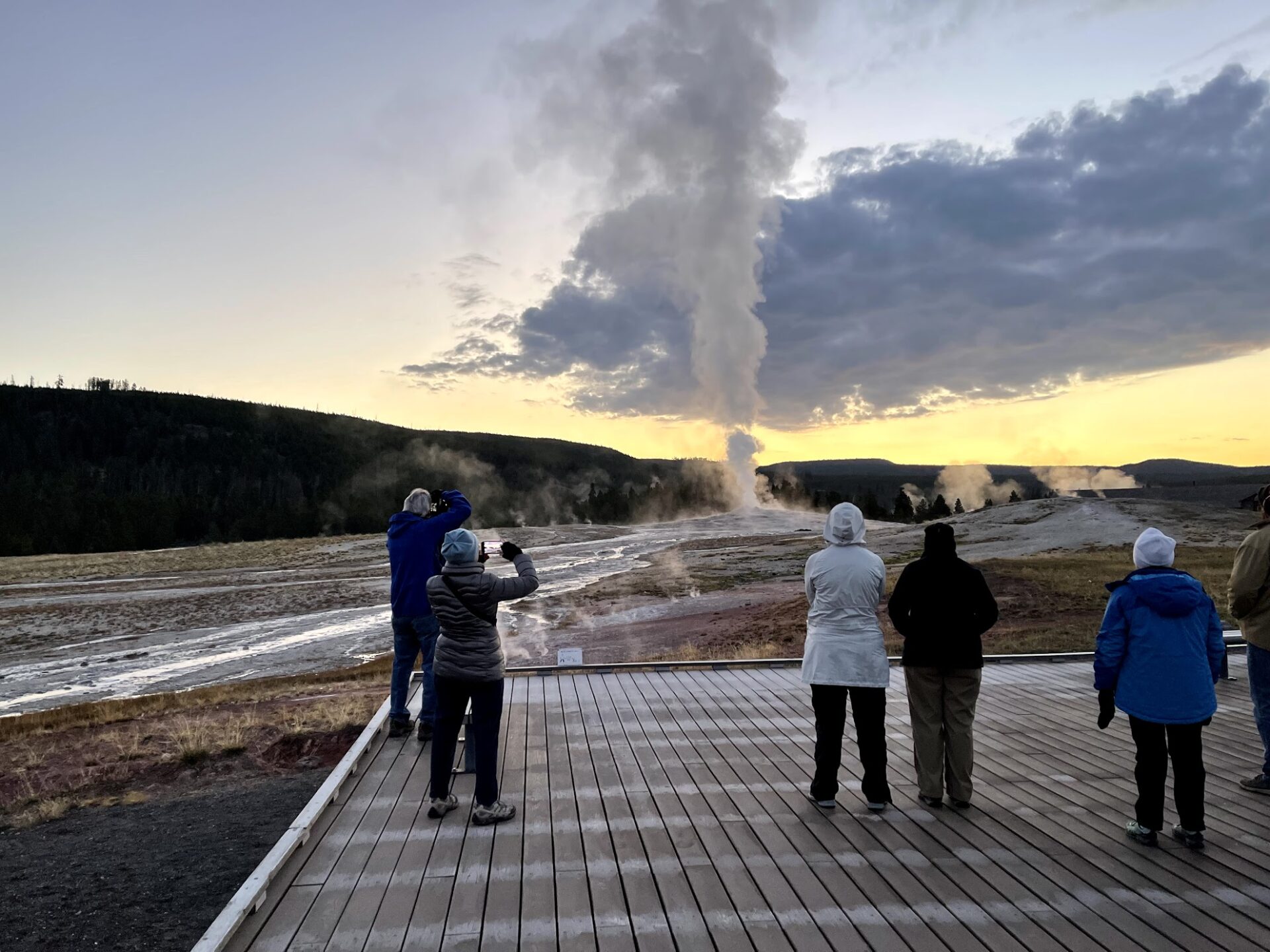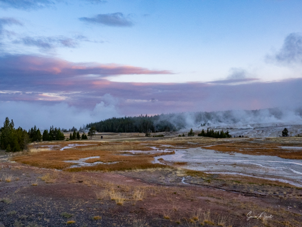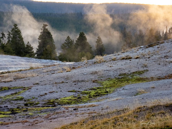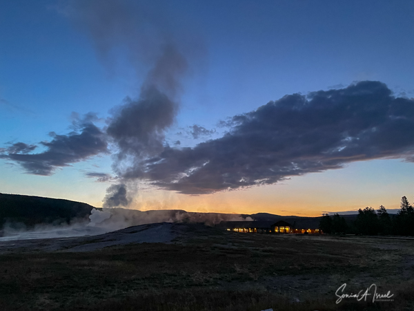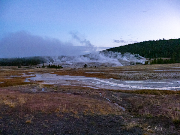 While I did not get to watch the sun set with Old Faithful, I did get to watch the sun rise. We arose early, got dressed very warmly and walked over to the geyser viewing site. At first we were the only ones there so we could set up tripods and stand at our favorite spot. Slowly, slowly, a few other intrepid folks joined us. It was still dark and it was cold.