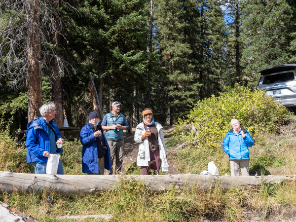 One morning, we made a stop at Yellowstone Lake, the largest body of water in the park, at 136 square miles and an altitude of 7732 feet. It is also the largest freshwater lake in all of North America. It was clear from the canoes on the shore that people enjoy boating and fishing here. We just enjoyed the views and stretching our legs as we walked along the shore.