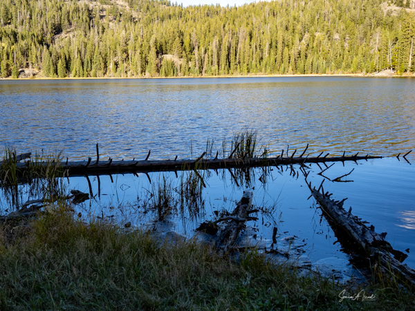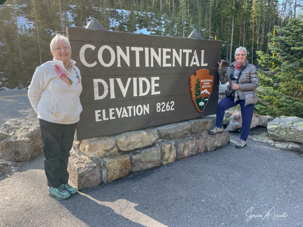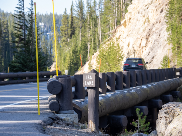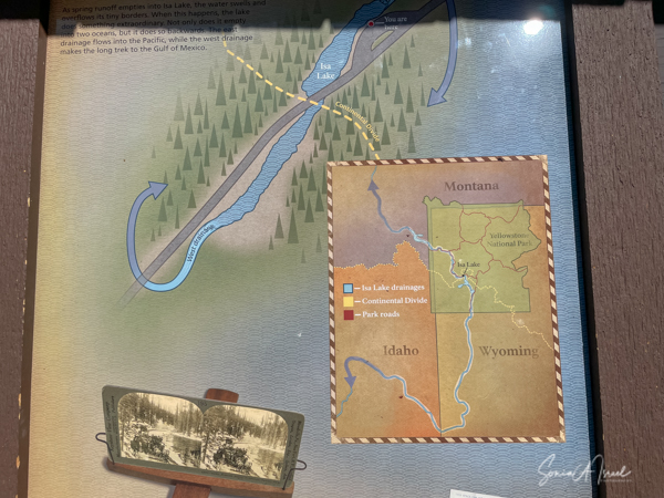 I never realized that the Continental Divide of North America runs diagonally through the southwest portion of Yellowstone with about one third of the park lying on the west side of the divide. We drove over it at three different places. What is the Continental Divide? It is topographical feature that separates the Pacific Ocean and the Atlantic Ocean drainage. The origin of the Yellowstone River and the Snake River are near each other, but on opposite sides of the divide, so one flows into the Pacific and the other into the Gulf of Mexico. We stopped at Isa Lake which straddles the Continental Divide at Craig Pass.