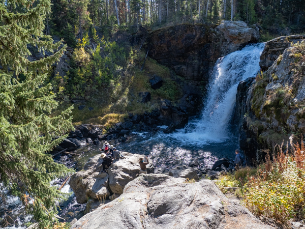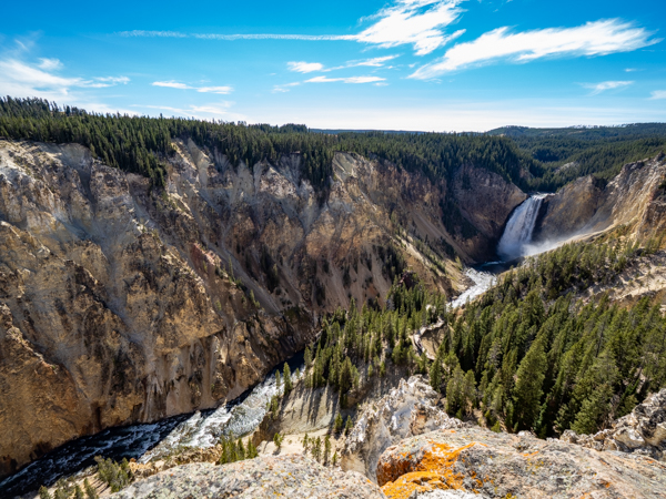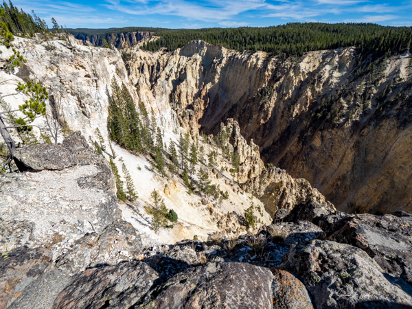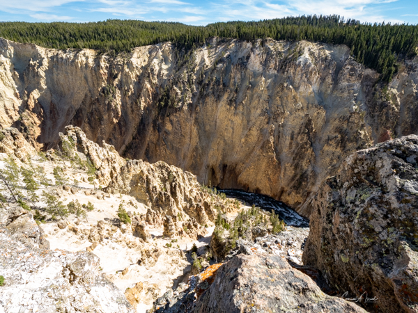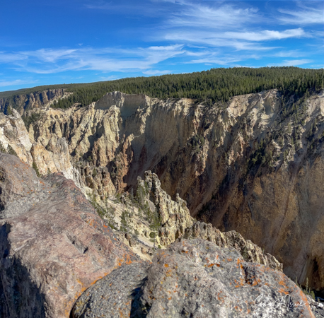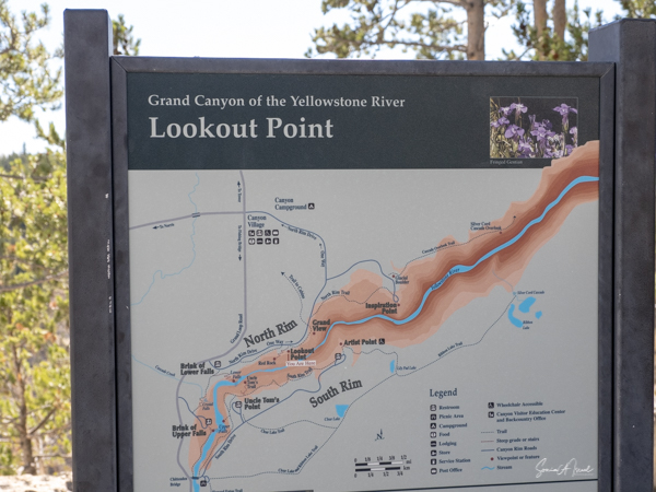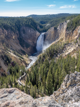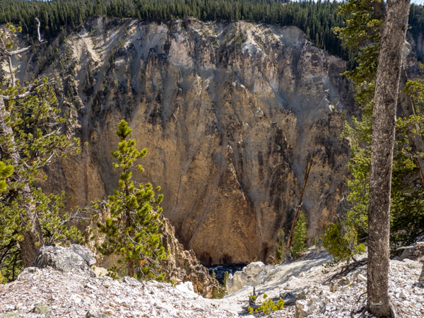 We stood where the canyon first begins, at Lookout Point where we could gaze at the 308 foot Lower Falls. It is believed that the Lower Falls formed from the river flowing over the volcanic rock which is more resistant to erosion than the hydrothermal rocks downstream. Turns out that the Lower Falls are the largest volume waterfall in the Rocky Mountains, almost twice as high as Niagara Falls, although the flow rate is much smaller.