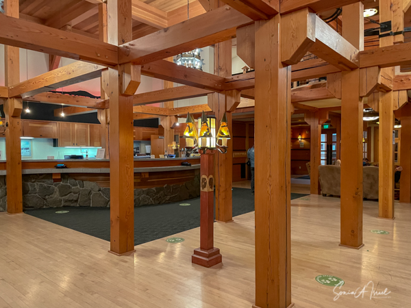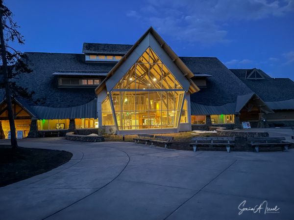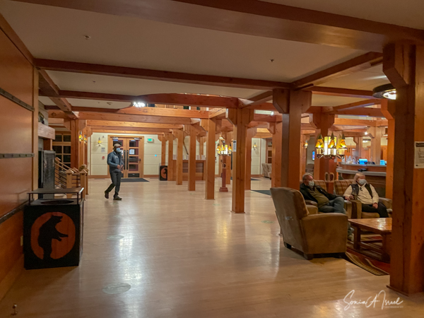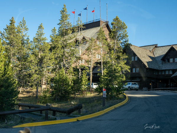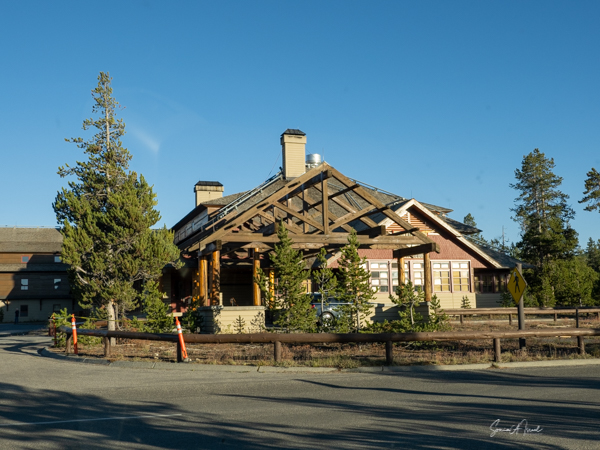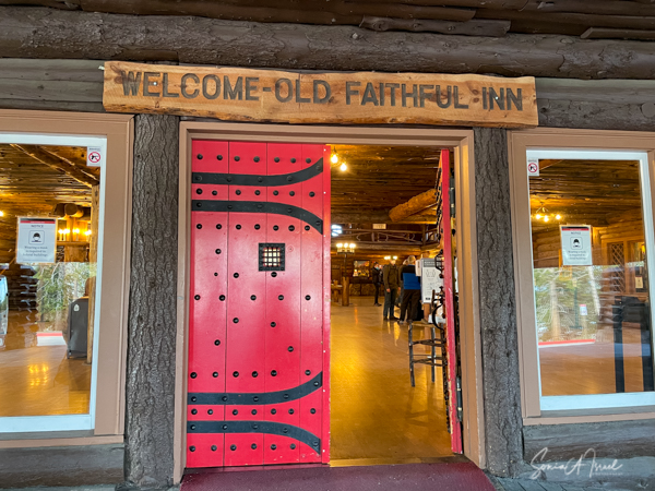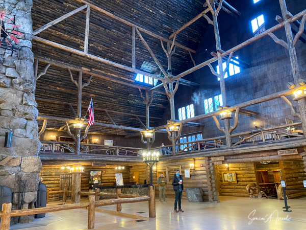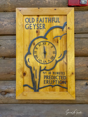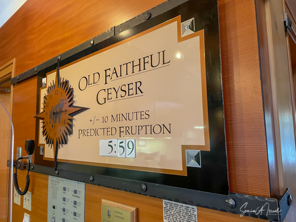 We finally drove to our hotel, the Old Faithful Snow Lodge, which was on the property of Old Faithful Inn. The hotel lobby was beautiful, all in wood. There were sitting areas with fireplaces, although no one wants to sit around during COVID. Like all the hotels here, there was an âeruption clockâ that estimates when the next eruption will occur. Since we are still in times of Covid safety, the restaurants were not really open. We ordered take out at the window of the restaurant and took it outside to eat. It was a bit chilly so we ate quickly. There were also plenty of crows around eyeing our food which also encouraged us to eat fast.