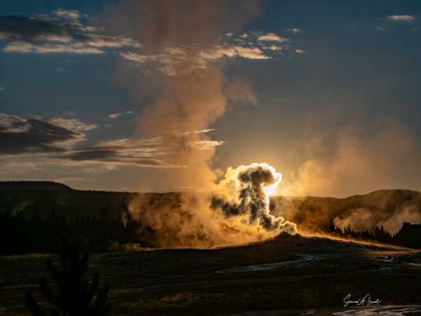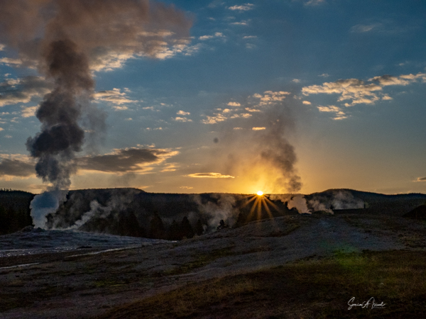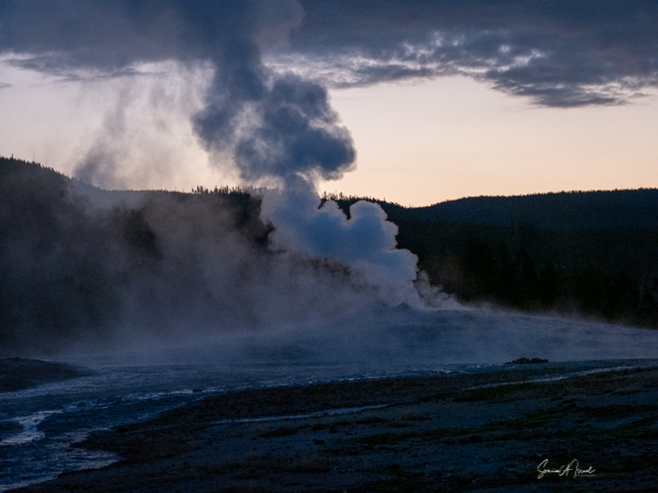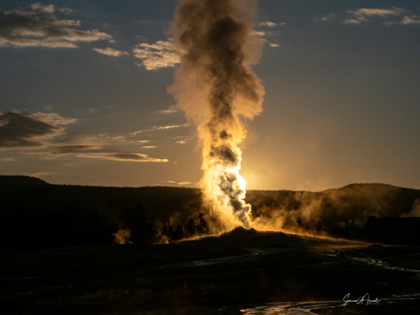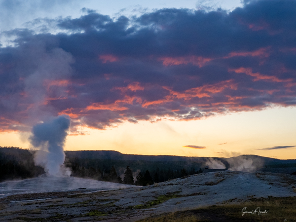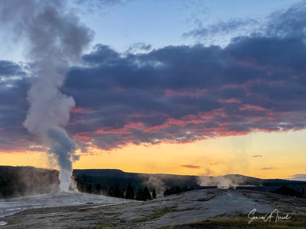 And then the sky started to lighten just a bit on the horizon, and the clouds turned a light pink and then a vibrant pink and then yellow. And the sun began to peek over the mountain. We decided, and when I say we, I mean Kurt, that we should move so the sun would be directly behind the geyser. So we repositioned and waited for the eruption. And we were not disappointed. Seeing the steam backlit by the sun made it look like it was on fire.