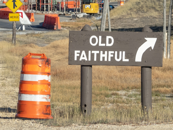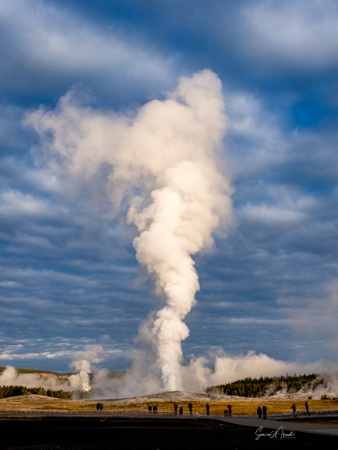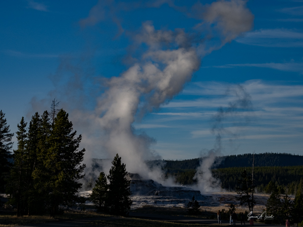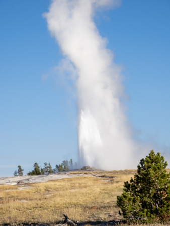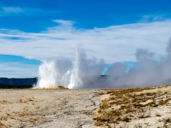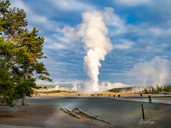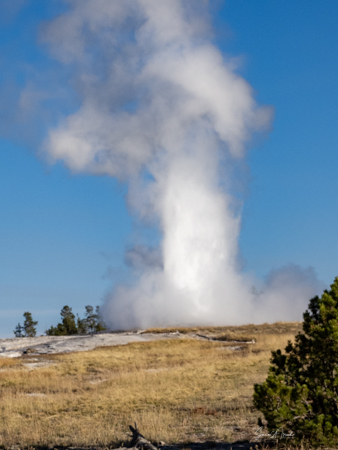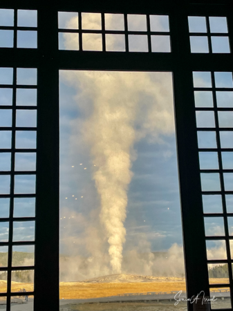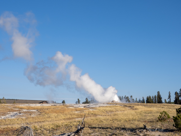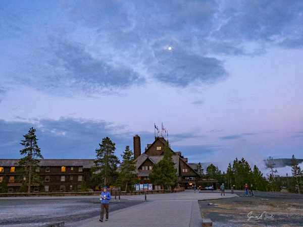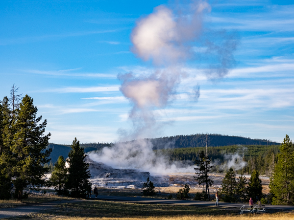 We were going to drive to the hotel, but, since we knew that Old Faithful erupts about every 90 minutes, and Kurt checked, we realized we had just enough time to park and walk over to see the eruption. And just as we began to approach it, off it went. Steam high into the sky.