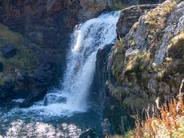 What was peculiar about this fall was that the water appeared to be geothermally heated and there were indeed people swimming in the creek. I walked down to the end of the path and then stopped, a bit nervous of climbing over the rocks to the very bottom. But then Travis, one of our travel buddies took my hand, told me I didnât want to miss shooting up at the falls, and helped me down. He was right.