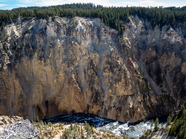 The Grand Canyon of Yellowstone is located in the northeast part of the park, where the waters of the Yellowstone River plunge over the Upper Falls and the Lower Falls. Standing here, I could see so much of Yellowstoneâs geological history. The colors â brown, dark orange, green – and shapes – all spoke to the evolution of the place. And as in so much of Yellowstone, I could see puffs of steam in the walls of the canyon, coming from the hydrothermal areas.