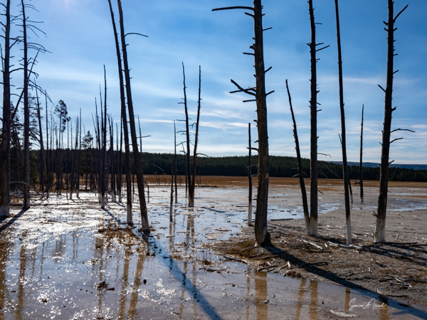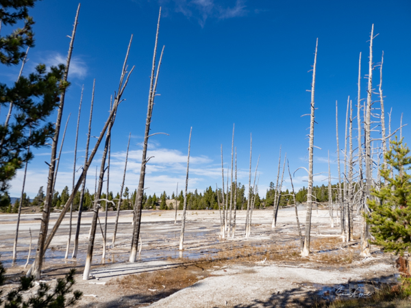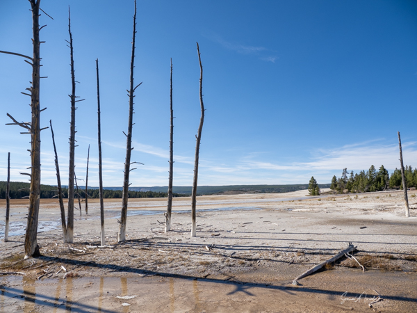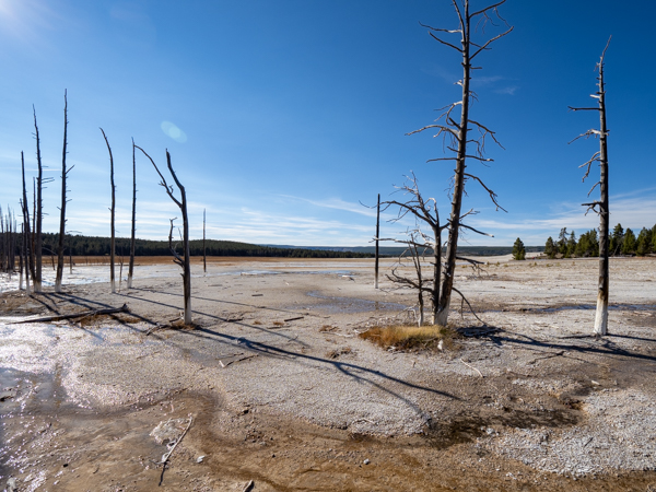 We got onto the boardwalk here and began our loop. The first sight reminded me of Sossusvlei in Namibia (please see that post). It was a large white, barren area with dead, black skeleton trees poking up into the blue sky. Similar to the Mammoth Hot Springs area I described above, it was barren and eerie and gorgeous.
