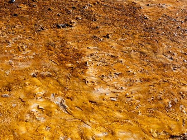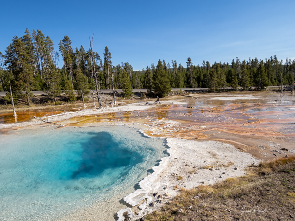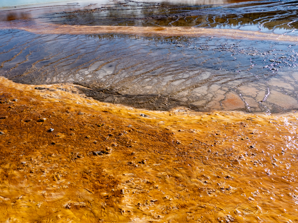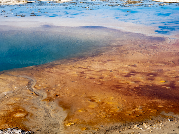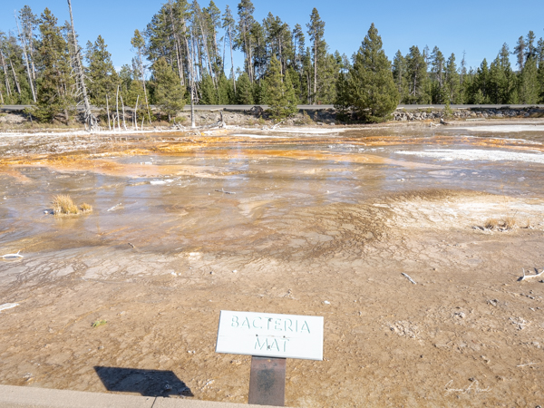 We kept walking and came across an area labeled Bacteria Mat. It looked like someone had dropped spoonfulâs of oil into water to make these shapes of orange and brown and yellow. And then, as if the surface had been broken like an egg, there was a beautiful vibrant blue pond. The colors formed by the bacteria were just spectacular. It was almost hard to fathom that this was real and not a painting.