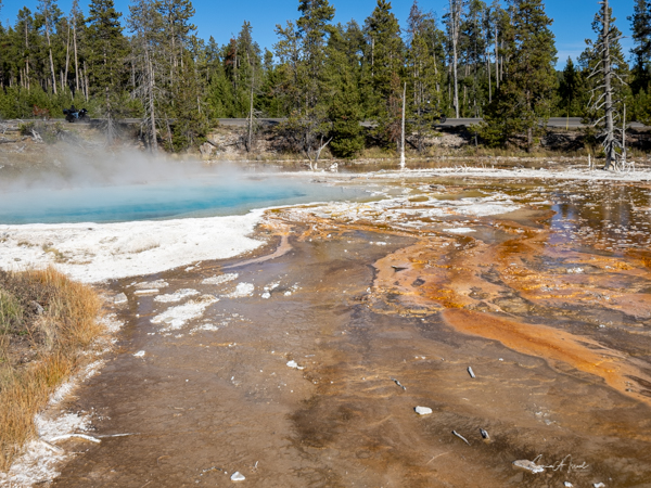 As I kept walking down I came upon huge mounds of orange. This was Orange Spring Mound. Why orange? There are thermophiles (a bacteria that thrives in heat) living in the hot water under the vents.
