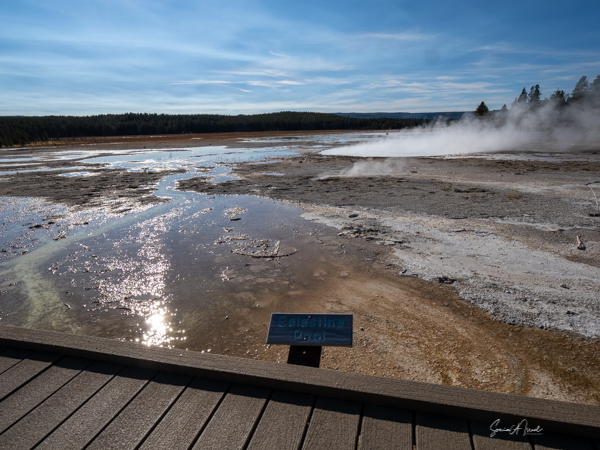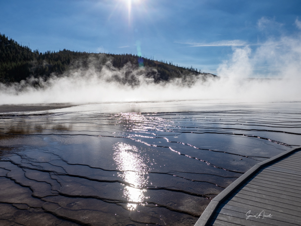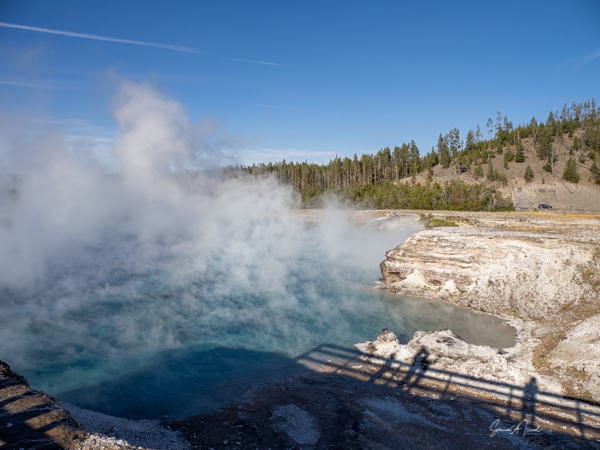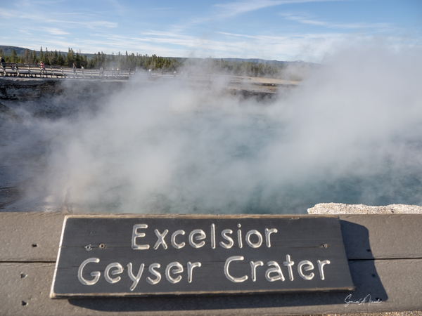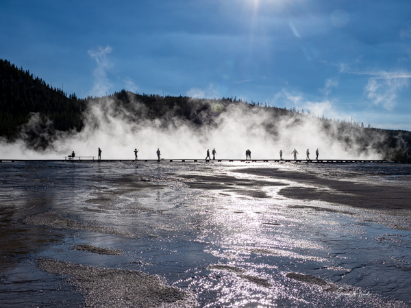 We kept going around the boardwalk and in the distance the steam was rising and the figures of the people were in the shadows. It looked like a painting. It was the Excelsior Geyser Crater.