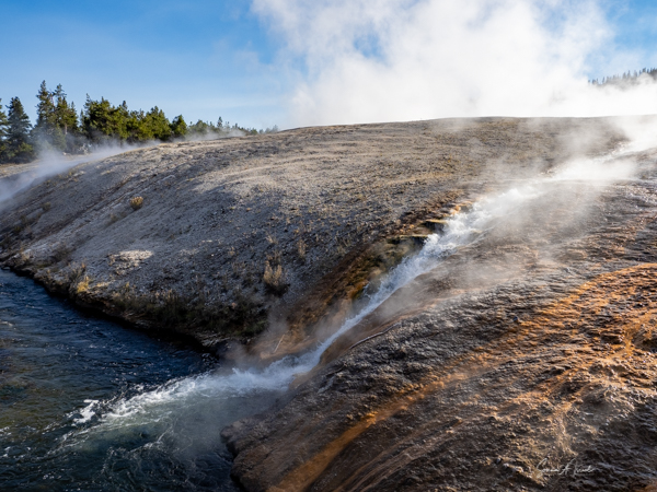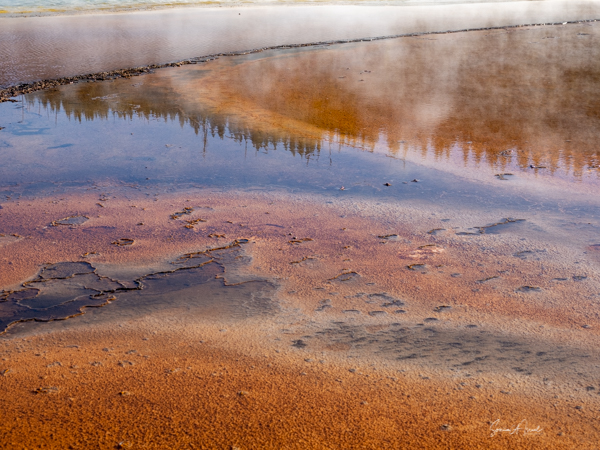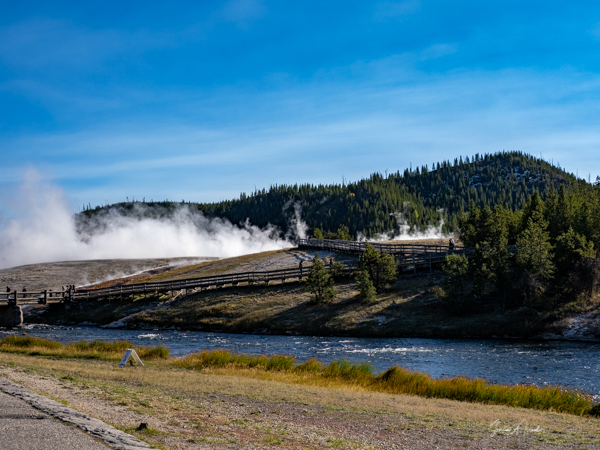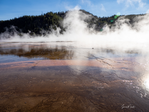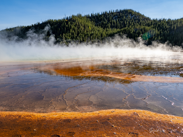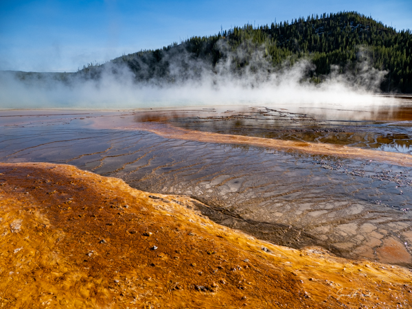 Even as we approached, we could see the steam rising from the Firehole River surrounding the basin. The shore was brown with streaks of orange running through it. We walked up a small incline and our first sight was the Grand Prismatic Spring.
