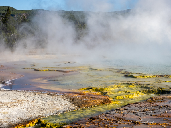 The Grand Prismatic Spring sits on a large mound and is surrounded by small terraces which look like steps with the water flowing evenly on all sides. It measures at 250×380 feet (bigger than a football field) and is the largest hot spring in Yellowstone and the third largest in the world (the other two are both in New Zealand). It too is dormant and as a hot spring, discharges about 560 gallons of water per minute. As I mentioned above, this is one of the most photographed and most famous hot springs. And it is even more beautiful than any of the photographs you have seen. It has been described as the center being a deep blue surrounded by a pale blue, with green algae around the shallow edge, and a band of yellow fading into orange and then red surrounding the whole thing. As with the Excelsior, there is often steam covering the spring but the reflection of the colors on the steam adds to the beauty. As with all hot springs, they are different each day. What we saw was a large white mound trimmed in yellow and surrounded by a thin stream of blue. Right next to it was the rest of the pool, but we saw little blue. It was mostly yellow and orange and red and brown. And yes, breathtaking.