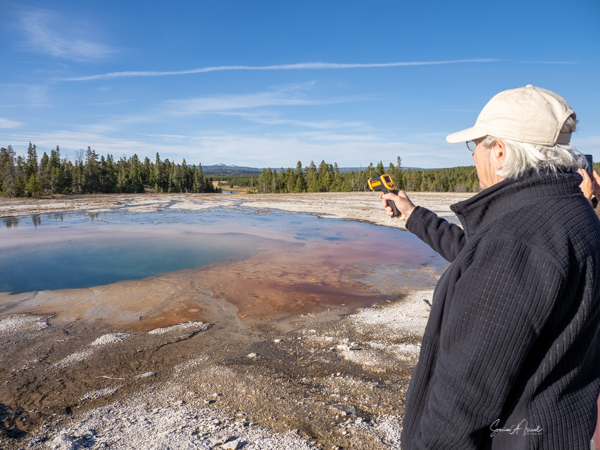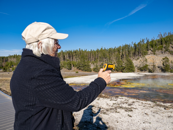 And the temperature of the spring? 147-188°F. Kurt gave us a thermometer to point at each pool, teaching us that the temperature will be cooler at the brown areas, then orange, then yellow, with blue being the highest temperature. Joan took the thermometer and measured at each of our stops. And of course, Kurt was right.
