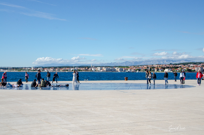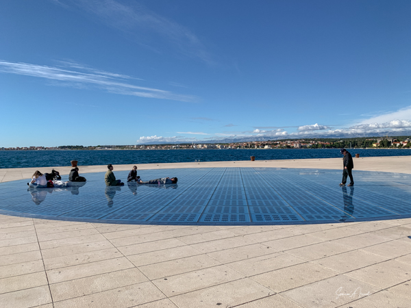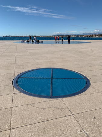 Jan drove into town and we marveled at the beauty of the sea, the yachts docked around, the people milling about. He made a circular detour to show us the Greetings to the Sun. I had no idea what that was, but I could see groups of people sitting or kneeling on what looked like a large glass circle. Jan said something about listening to the waves, but still, I had no idea.\