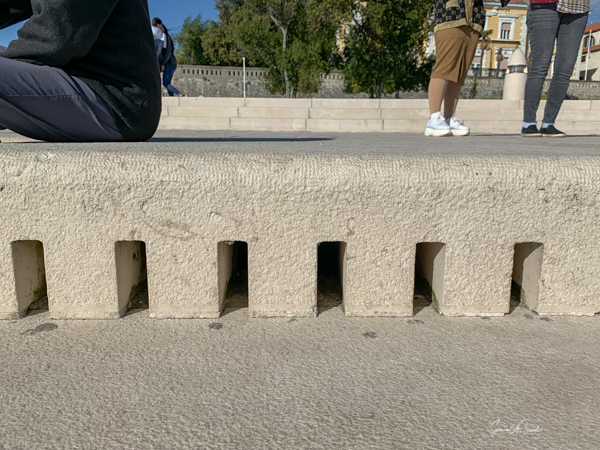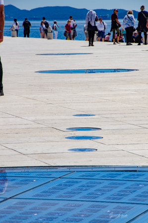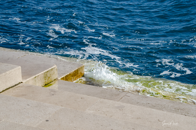 Right next to the Greetings to the Sun are some stone steps at the water’s edge. This is the Sea Organ. Both the Greetings to the Sun and the Sea Organ were designed by the local architect Nikola Bašić. Within the stone stairs is a system of 76 yards of 35 pipes, each of different lengths. The waves push air into the pipes creating music which comes out of holes in the ground. It works the same way a flute does. The more waves there are, from the wind or from passing boats or ferries, the louder the music. We sat for a bit listening to the wistful sighs. The tones changed in pitch and in volume. It was almost hypnotic.