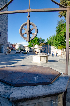 In the Middle Ages there was a defensive ditch, or moat, below the old city walls. Later, during the 16th century, the Venetians helped Zadar withstand Turkish sieges by building a large drinking water cistern with five ornamental wellheads. And thus the name of this square, Five Wells Square. These wells supplied Zadar with water until 1838. The wells no longer provide water, but rather are a place for skateboarders to practice their skills. We had to dodge them as we walked around. But that was easy to do as the square is now totally empty except for the wells, belying the fact that this was once a military storage facility or bastion.