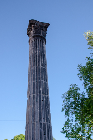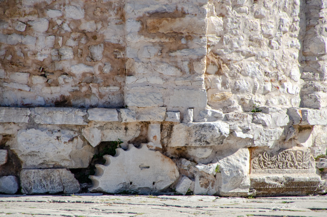 We walked past a flea market of stalls with souvenirs and stalls with flea market type antiques – everything from records, porcelain statuettes, jewelry, tools and even old guns. And just to the side of the market was the Roman forum. It seemed almost random to see it as the large plaza was filled with pieces of Roman columns, all taken from other parts of the city and placed here as a museum. The Forum itself was commissioned in the 3rd century by the first Roman Emperor Augustus whose name is inscribed in stone. It was one of the largest in the Adriatic at 147 feet x 314 feet. It was the center of all public life, both civic and religious. It must have been magnificent with three sides closed by a two-story building with colonnades and the upper level open to the temple of Jupiter, Juno and Minerva (see below). We could also see the foundations of what once a row of shops. Just about everything was destroyed in a large earthquake. Some of the original pavement remains. And one pillar of shame.