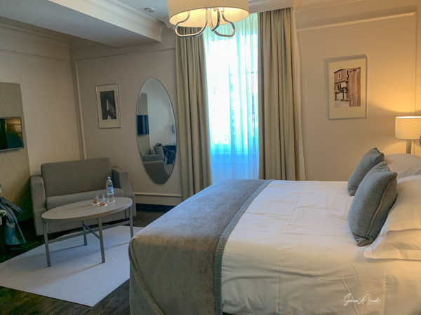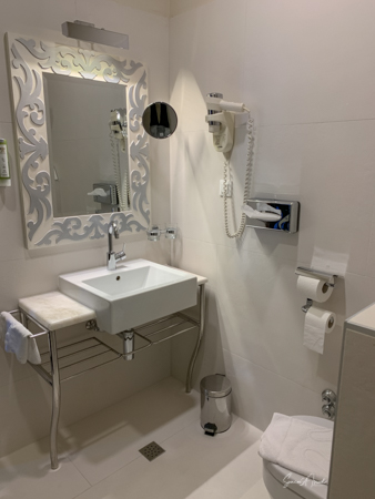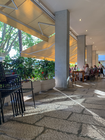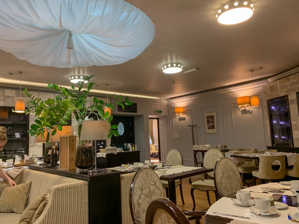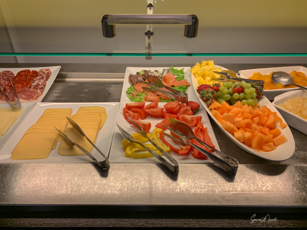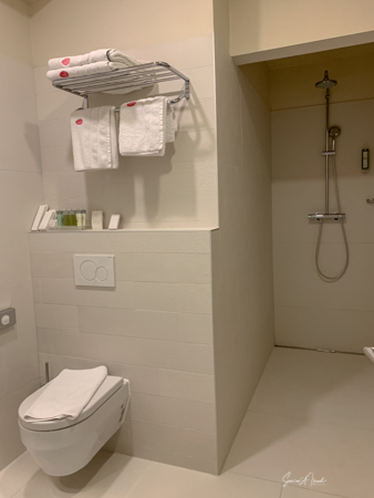 The hotel is modern in almost a deco style. The room was large with a two-seater couch, a desk and chair, robes, slippers, a large shower with both a hand-held and a rainfall spout. The amenities included razors and toothbrushes. The window opened so you could get fresh air and take pictures without the glass in the way. Breakfast was the usual buffet with cheeses, meats, fruit, cereal, yogurt, breads. But there was also a menu for eggs and crepe. Andy had a crepe with marmalade (although he could have had one with chocolate). The hotel is very convenient to everything in Old Town.