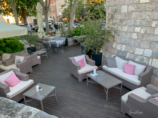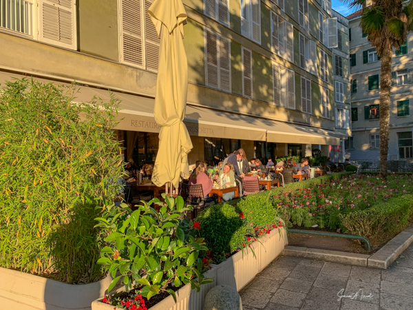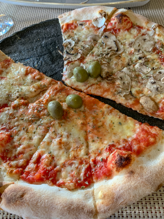 Yes, it was time for dinner. Philip at our hotel has recommended a restaurant named Bruschetta. Again, Italian. So after our walk around the town, we tracked it down. It had a large outdoor seating area overlooking the sea. We checked out the menu. We had had a large lunch and were in the mood for pizza. I looked over the menu and to my disappointment, no pizza. So I handed it back to the maître d’ and sad, “Sorry. You don’t have pizza?” And she said, “We do, but it is on the last page, not in the front with the rest of the menu.” Great! She showed us to a table that was inside, but at a large open wall so it was as if we were outside. I had a glass of Croatian Sauvignon Blanc and then Andy and I shared a pizza. Oh, and of course we had the traditional bruschetta. It was the best bruschetta I’ve ever had. And the pizza was as good as in Sicily.