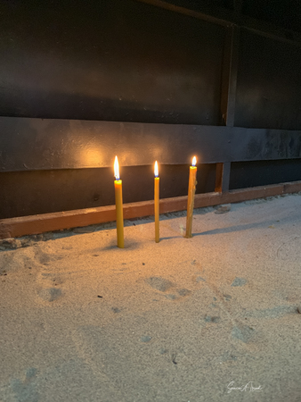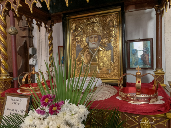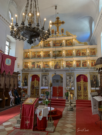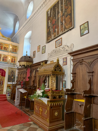 The church is not always open, but today the door was open and we went in. The priest was sitting there chatting with an old woman. The church was one small room fully decorated with a huge collection of icons dating from the 16th-18th centuries. There was a section for the women and a large painted screen to separate the priest from the people.