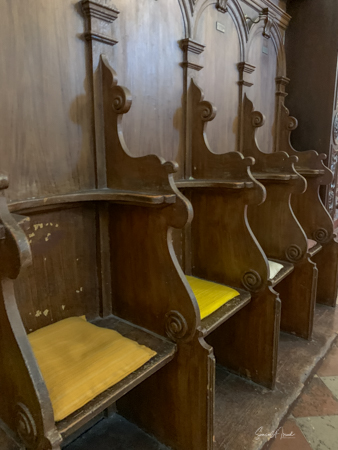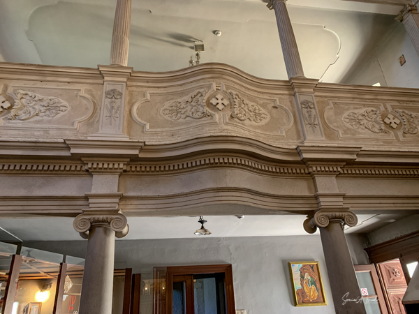 We walked up a flight of stairs into a dark room with spotlights on the gold relics. Inside the gold was a relic, a bone of a martyr or saint or a priest or other important person. The shape of the gold was the giveaway of what was inside. An arm, a hand, a skull, a leg. Each piece of gold was carved and each was more beautiful than the previous one. There were also crucifixes, paintings, and vestements interwoven with gold and silver thread. We walked up another flight of stairs to the third level and the first thing we saw were some life size wooden statues of men. I figured they were the 12 apostles but I only counted 10 of them. Tamara explained that indeed they were the apostles, but two had been destroyed, so now they are displayed here in the museum instead of in the church.