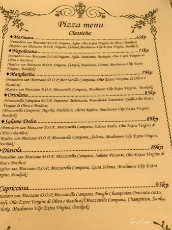 We were there a bit early as it was about 1130, early for a Croatian lunch. The server told us that we could order whatever we saw on the menu except pizza, as the pizza oven was not yet hot. We mentioned that we had come for pizza, so she brought drinks.
