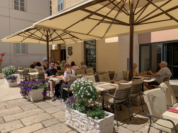 Once we had dropped off the luggage and settled in a bit, we came back to the front desk to get a map and suggestions on what to see and what to do on our free afternoon. Philip, who was extremely friendly, talkative (in a good way) and knowledgeable, grabbed a map and began to tell us all about the town, where to go and some of the history. He was born and grew up here as did his parents and grandparents. He showed us where the Roman ruins are. He explained that there was once lots of Italian architecture buildings but they were all bombed by the allies during WWII, although there was no military presence here. But it was in an attempt to get at the fascists. Why Italian buildings and why Italian restaurants all over Zadar? Philip explained that Zadar was part of Italy for many years, on and off (more on this history later). He told us that everything that that is good in Zadar was from that Italian period. Everything they have that is good is from then. For example, he said, his grandfather‘s bicycle. And as he continued to show us spots around the map, he was sure to circle the supermarket because that’s where his grandmother, who is retired, now works. That showed strong family ties. Another Italian trait (and Jewish and Chinese and many other cultures. Probably Croatian now too!).